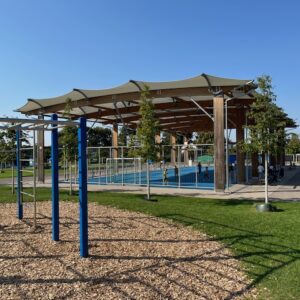 Dafür wurden die Flächen entsiegelt und neben unterschiedlichen Spiel- und Bewegungsangeboten zwei weitläufige Versickerungsmulden angelegt. Sie sind mit modernen Rigolen verbunden. Das Regenwasser sammelt sich in den Mulden, versickert und gelangt so in Baumrigolen, die mit Schottersteinen gefüllt sind. Dort steht es für die über 60 Bäume und Sträucher zur Verfügung, die im Rahmen der Umgestaltung gepflanzt wurden.