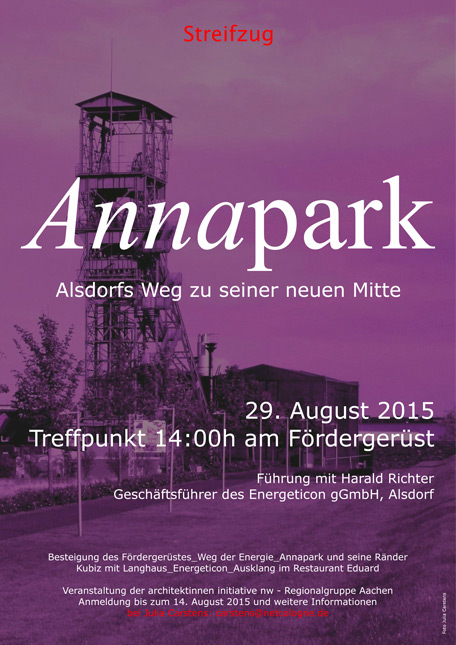 Auf der Grundlage eines landschaftsplanerischen Realisierungswettbewerbes von 1992 entwickelte sich ab 2001 der Annapark. Wie ein Phönix aus der Asche entsteht seitdem die neue Mitte Alsdorfs. Mittlerweile sind so viele Teile des Gesamtkonzeptes fertig gestellt oder im Bau, dass die Ergebnisse erlebbar sind. Der Streifzug beginnt mit der Besteigung des Alsdorfer Wahrzeichens, dem alten Fördergerüst der Grube Anna. Von dort werden wir den besten Blick auf das gesamte städtebauliche Areal haben. Entlang des „Weges der Energie“, ein Informationsweg rund um die Geschichte des Ortes, werden wir verschiedene Projekte am Annapark (Landschaftsplaner Ipach & Dreisbusch, Neu-Isenburg) streifen, z.B. das denkmalgeschützte Fördermaschinenhaus Hauptschacht und die Turbinenzentrale oder die Baustelle des Kultur- und Bildungszentrum, kurz KuBiz (gmp Hamburg, Fertigstellung Sommer 2016), mit dem denkmalgeschützten Langhaus als zukünftige Mensa und Quartiershaus. Endpunkt des Spaziergangs ist das Energeticon (pbs architekten, Aachen und Heinrich Böll, Essen), ein 2014 eröffneter Kulturraum und außerschulischer Lernort zum Thema „Von der Sonne zur Sonne“mit einer eindrucksvollen Ausstellung (atelier Brückner, Stuttgart). Der Ausklang ist im Eduard, dem angegliederten Restaurant des Energeticons, geplant.