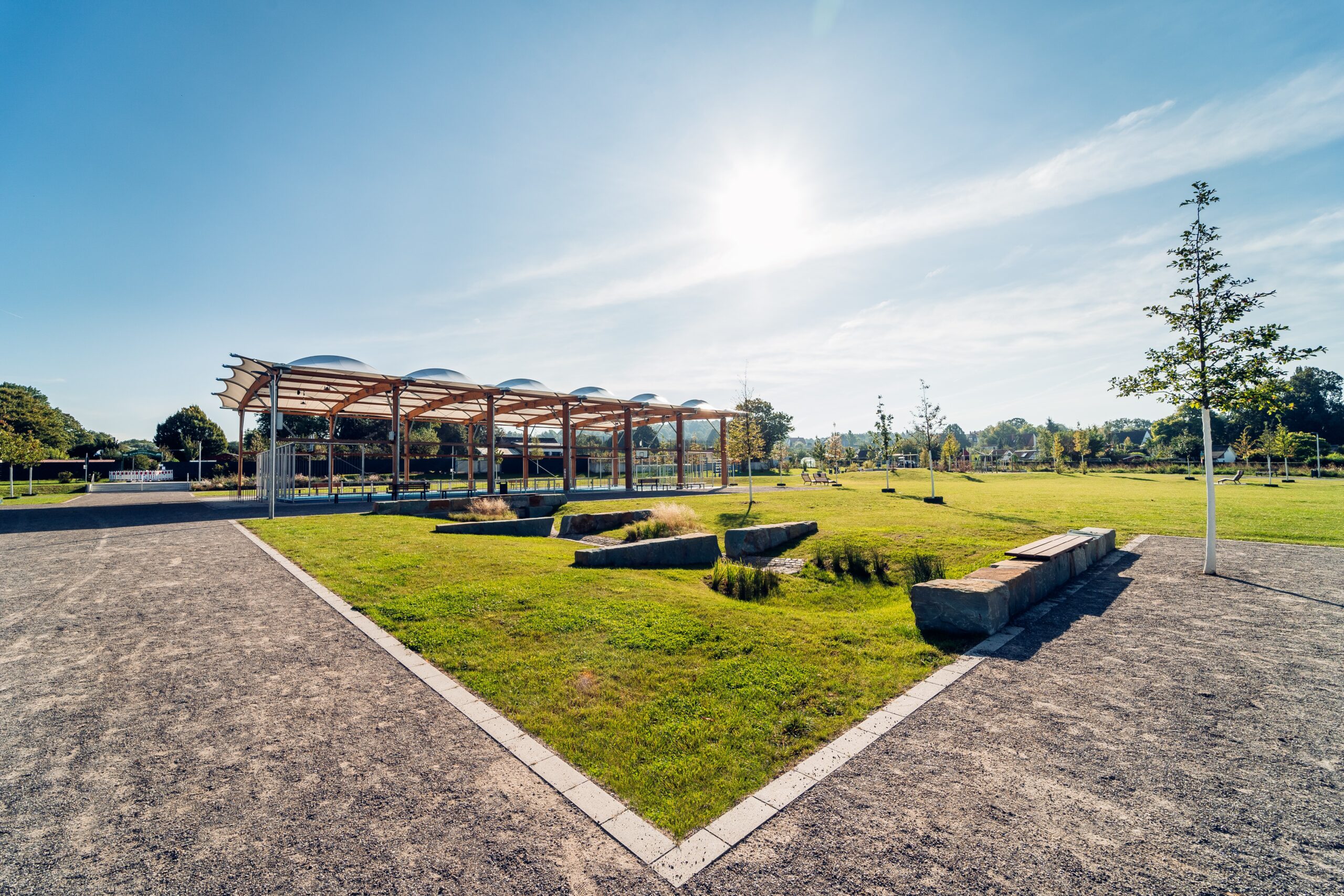 Das zweite Ziel der Exkursion wird ein ehemaliger Asche-Bolzplatz sein, der zu einer gestalterisch hochwertigen multifunktionalen Sport- und Freizeitfläche umgebaut und durch ein Mulden- und Rigolensystem gegen Hitzewellen und Starkregen gerüstet wurde.